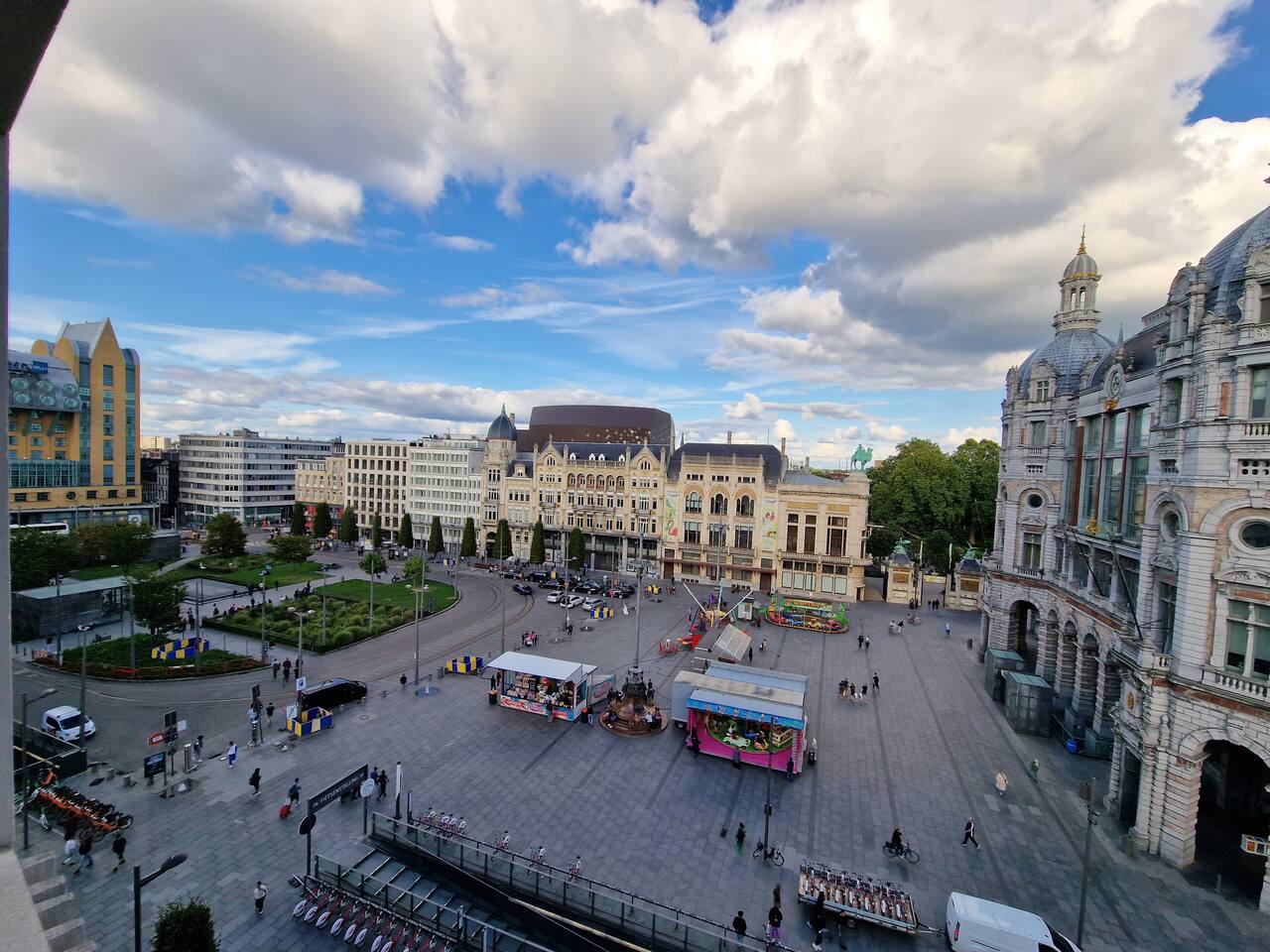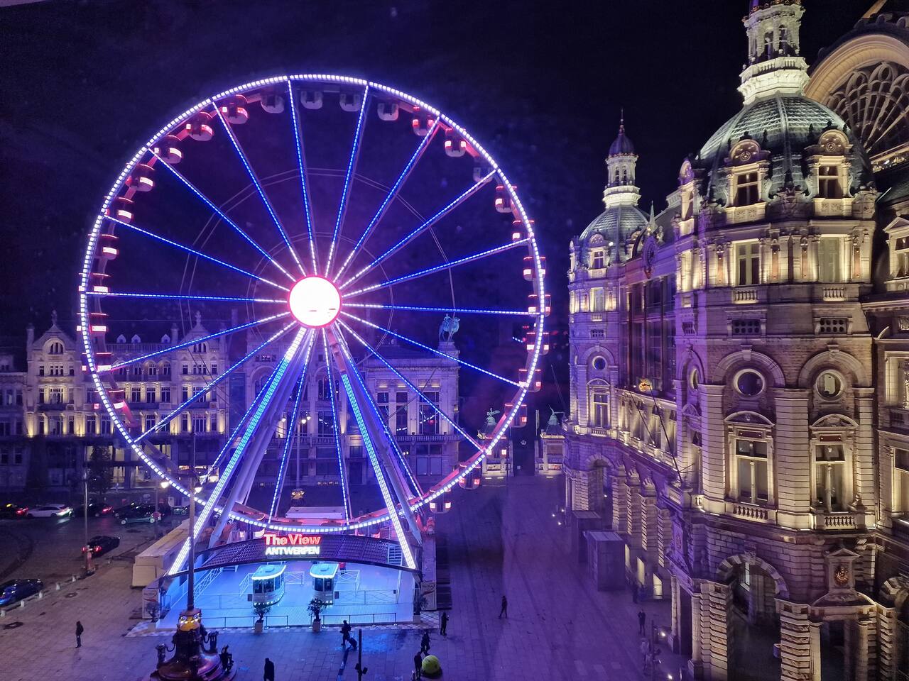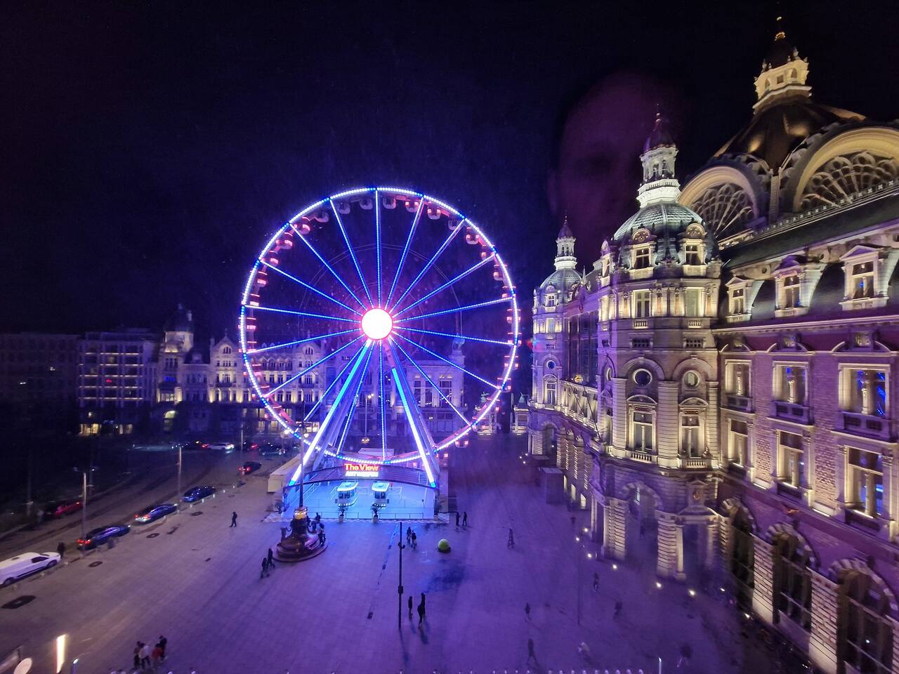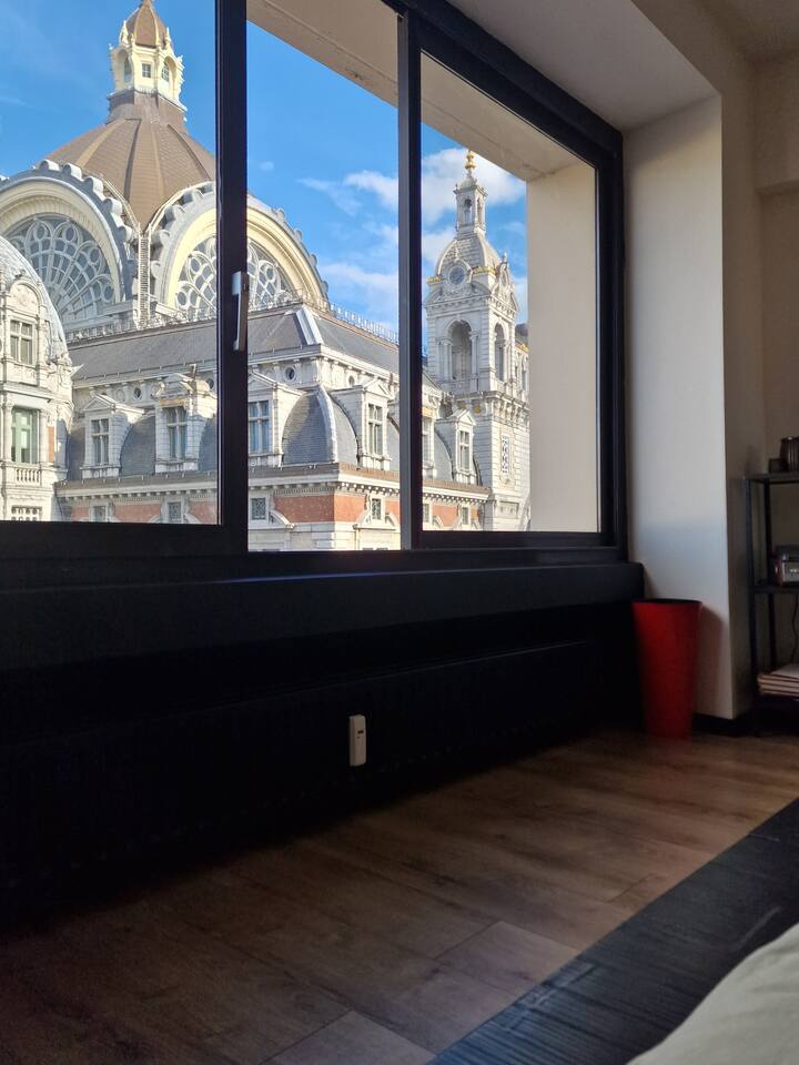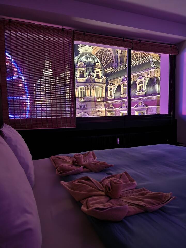 Last minute bookings until 12AM are possible 😉 Drift off to sleep under the glow of one of Europe’s most stunning landmarks — Antwerp Central Station, beautifully illuminated right outside your window. The vibrant colors of the Ferris wheel (22.09.2025 now being installed) and majestic architecture create a dreamlike atmosphere you’ll never forget. Q-Park Astridplein in front of the building €27/day or 3 mins further for 20 euro/day Indigo Zoo Parking. P&R parkings for €1/day+€2.5 tram.